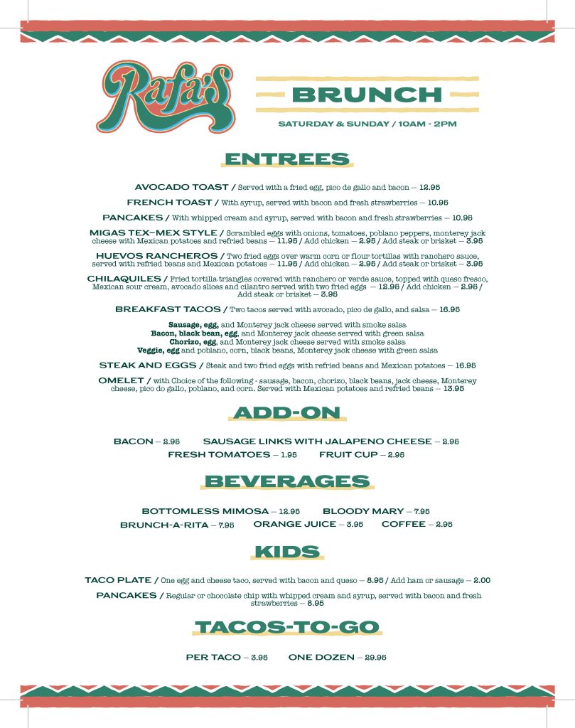 Brunch is served fresh and delicious every Saturday and Sunday from 10 AM to 2 PM at Rafa’s Cafe! 🌞🍴 Enjoy crowd favorites like Migas Tex-Mex Style, Huevos Rancheros, Chilaquiles, Avocado Toast, Steak and Eggs, and more! 🥑🌮🥞 We’ve got special plates for the kids too, making it a perfect weekend treat for the whole family.
