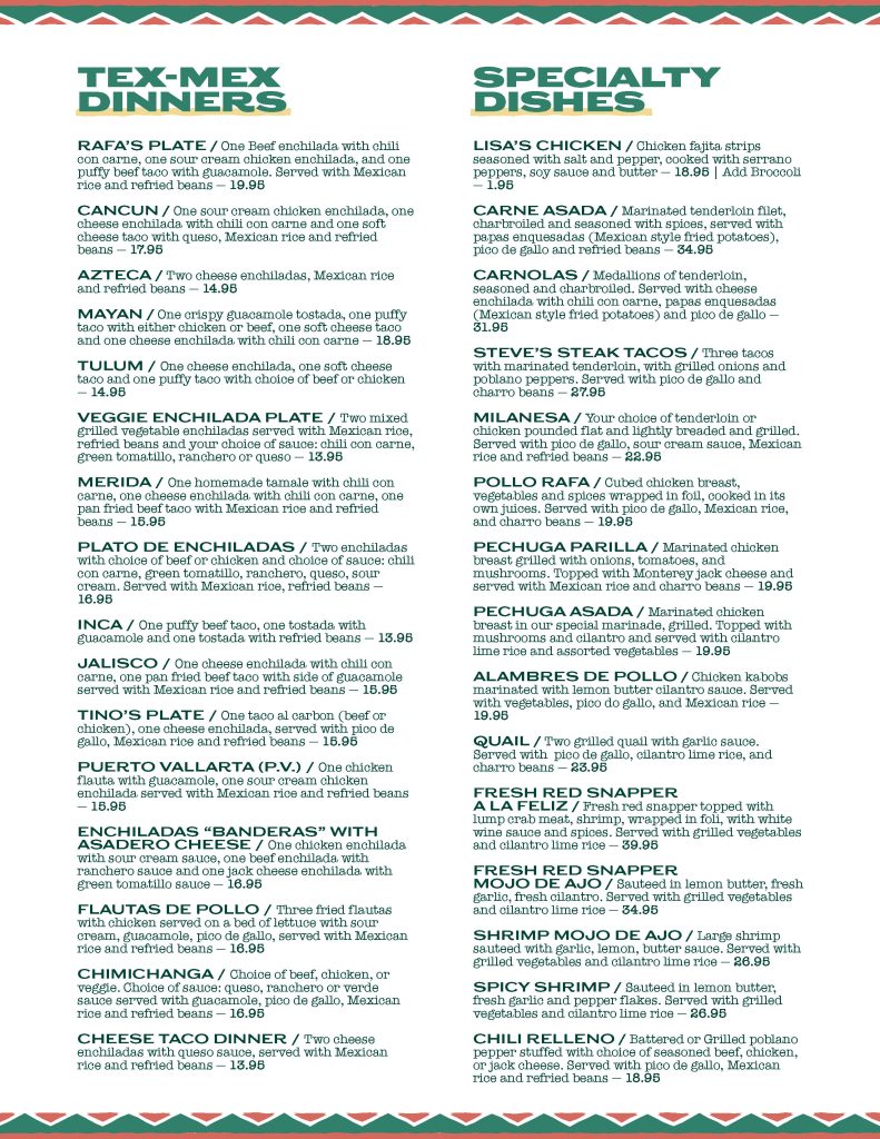 Rafa’s Cafe is a family owned San Antionio style TexMex / Mexican cuisine restaurant with a large selection of specialty margaritas and tequilas.We’re well known for our traditional Tex-Mex cuisine, such as our puff tacos, cheese enchiladas and savory fajitas. We hope our customer service and great food will make our family restaurant a great experience.